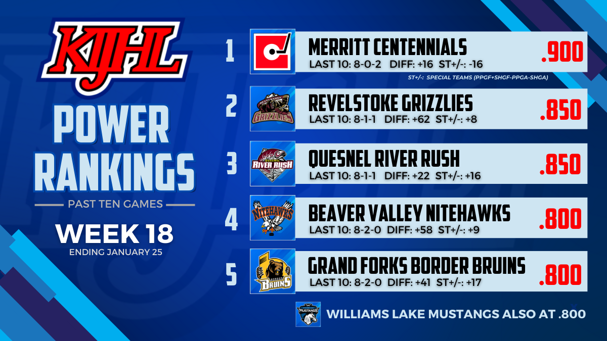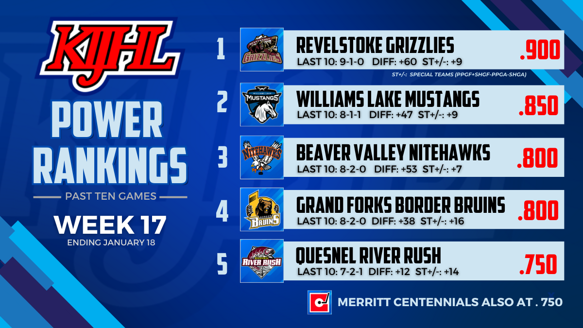 The Kootenay International Junior Hockey League (KIJHL) is pleased to announce its Power Rankings for Week 16. The Revelstoke Grizzlies have taken the No.1 spot from the Beaver Valley Nitehawks following a pair of wins last week. They defeated the Kelowna Chiefs 4-3 in overtime. Maddox Popke scored twice (4), including the winner and […]